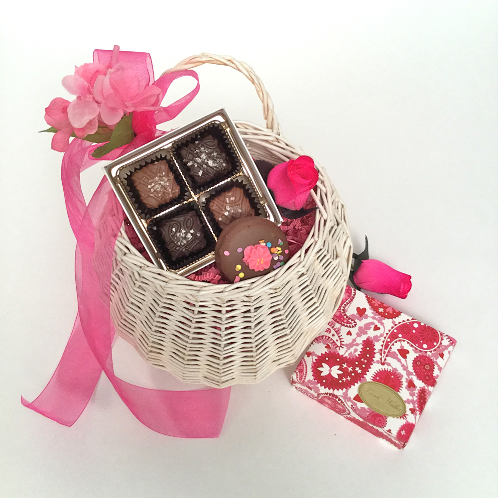 This delightful spring basket is is beautiful way to show you care! The hanging basket contains a four piece box of soft and chewy sea salt caramels covered in both milk and dark chocolate, and a milk chocolate covered Doubl Stuf Oreo with spring decorations. There are very limited quantities of this basket available.